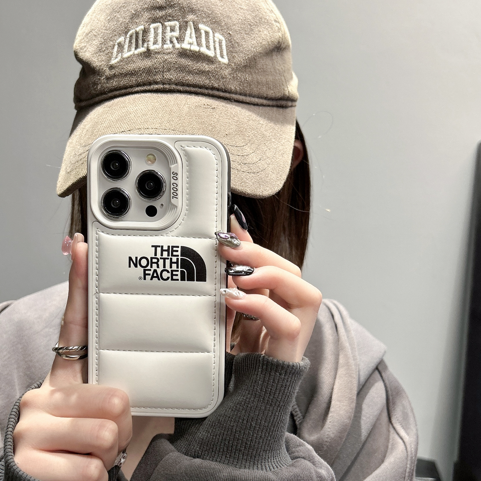 TNF Leather Puffer Phone Case for iPhone White combines premium leather craftsmanship with a padded design, offering stylish protection and a comfortable grip.